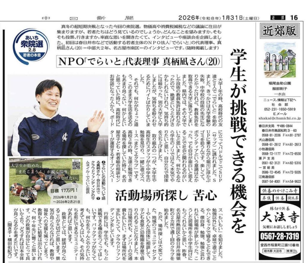 評議員・真柄 凪さんの活動が中日新聞に取り上げられました